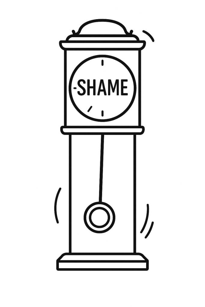The oscillating Pendulum-Effect suggests that the core affect of shame and/or self-hatred, symbolically located at the centre of the clockโs face, represents the central mechanism driving the system. The core mechanism does not turn the clock without the oscillating movement. In other words, shame, guilt, or self-disgust are constantly perpetuated by reinforcing, self-sabotaging life strategies such as overcompensation, avoidance, and surrendering. These are designed with the precision of an internal clock mechanism and rehearsed over many years.