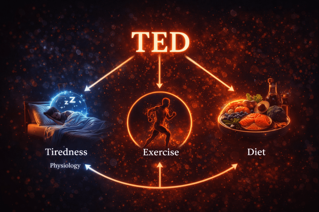 TED (Tired–Exercise–Diet) is a lifestyle-based self-regulation framework at the heart of NeuroAffective-CBT. It targets three key neuroaffective regulators: sleep and rest (Tired), movement and physical strengthening (Exercise), and diet/metabolism (Diet).