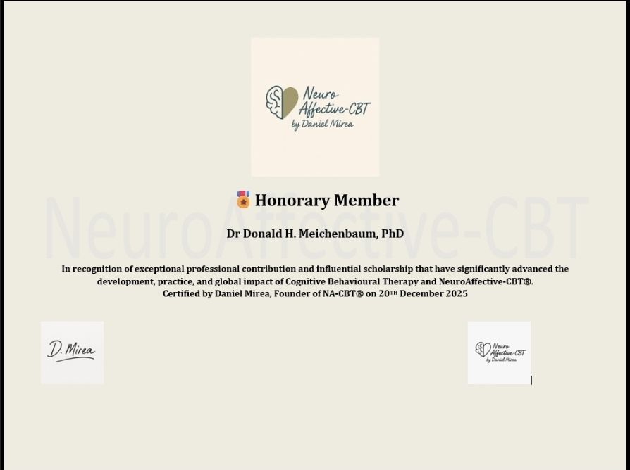 A substantial proportion of the theoretical principles and clinical methods underpinning NeuroAffective-CBT have been influenced by Daniel Mirea’s close collaboration with Dr Meichenbaum. This partnership has informed the integrative, humane, and evidence-informed ethos of the NA-CBT model.